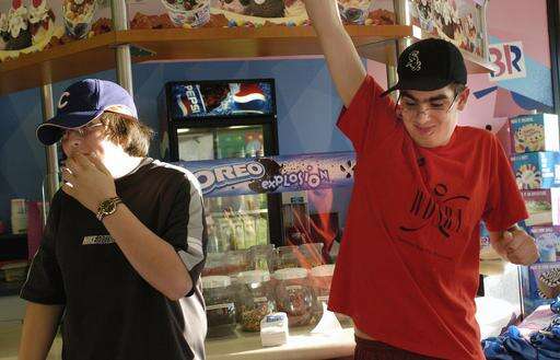 And the winner is … Michael LaVoie of Carol Stream, 18, right, celebrates his victory as the fastest licker of an Oreo Explosion cone during a competition with Perry Allston, 14, also of Carol Stream.