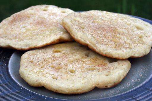 Cook until the entire surface of the pancake is covered with bubbles and they no longer have a sheen, yet remain pale. Remove the pancakes to a plate, cover with a towel, then repeat with remaining batter. Add shortening to the skillet as needed.