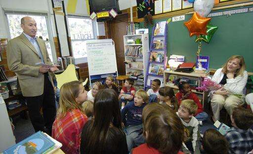 Matt Broad, left, executive vice president for OfficeMax, tells students at Naper Elementary how their teacher, Margaret Haumiller, far right, earned her the Teacher Innovator Award. Marcelle Bright | Staff Photographer