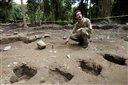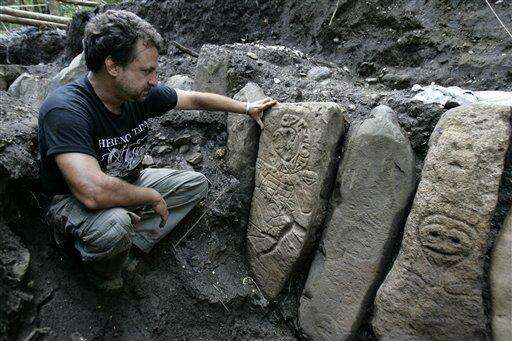 Puerto Rican archaeologist Hernan Bustelo sits next stones etched with ancient petroglyphs and graves that reveal unusual burial methods in Ponce, Puerto Rico. Associated Press