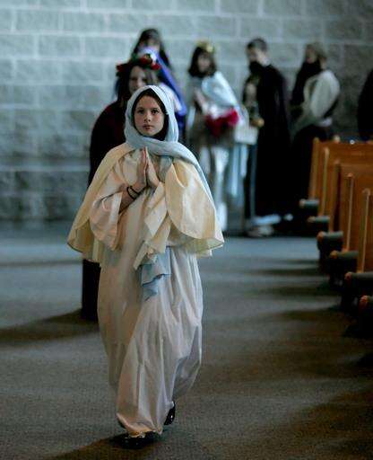 Molly Green, a sixth-grader at St. James the Apostle School in Glen Ellyn, is dressed as St. Veronica and leads the procession of sixth-graders celebrating an All Saints Day Mass at the school.