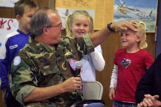 Navy veteran Luke Sanna give his daughter Cecilia's hair a tussle during a special Veterans Day celebration at Lincoln Elementary School in Glen Ellyn. Sanna was honored by his other kids as well, including Brendan, left, and Gabriella.