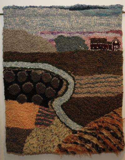 Make no mistake, Rotramel's creations are nothing like the latched-hook rugs you may have made in the 1970s. These are scenes created out of fabric, usually wool. One of the rugs has panels of complementary colors depicting a historic Massachusetts village. Another, created out of wool she dyed herself, is a tribute to the cornfield near her house.