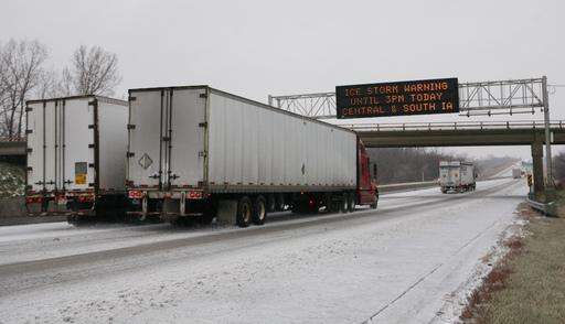 Trucks pass under a message board on westbound Interstate 80 indicating an ice storm warning near Des Moines, Iowa. Associated Press
