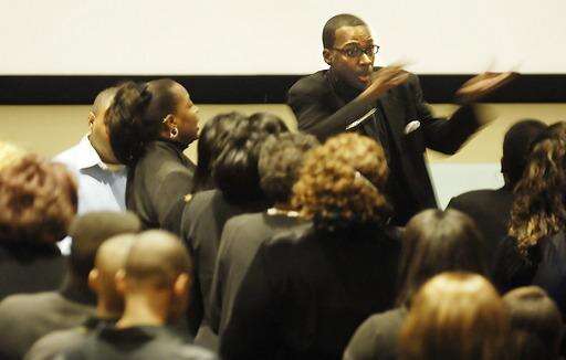 Shaan Jones, director the of Elgin Community Youth Choir, sings with his group Sunday during the 23rd Annual Martin Luther King Jr. Celebration, sponsored by the city of Elgin. The event was held at Elgin Community College. John Starks | Staff Photographer