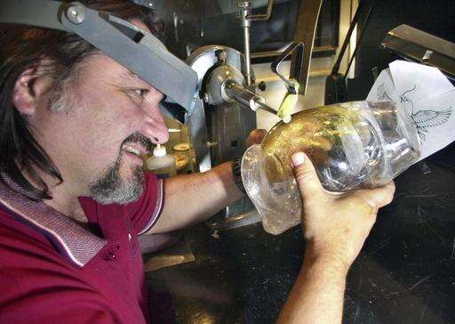 Harold Gross, fine arts engraver, uses a copper wheel to engrave a piece commissioned by the White House as a gift of state at the Steuben Glass factory inside the Corning Museum of Glass in Corning, N.Y., in this September 2003 file photo. Associated Press