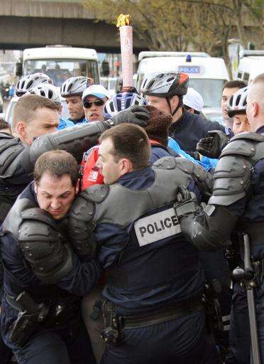 Policemen closely surround and protect the Olympic torch during its relay Monday in Paris. Security officials extinguishing the flame three times amid raucous protests. Police escorted the torch onto a bus on three separate occasions. Associated Press