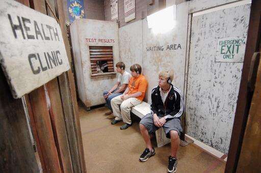 At the end of the exhibit, participants wait in a clinic to learn whether the children profiled in their audio journey actually live with HIV, the virus that causes AIDS.