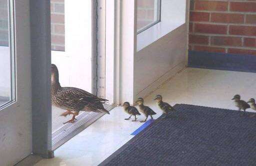 This spring was no exception. For the sixth year, the process repeated itself. Although the staff thinks this year's mother is new -- maybe one of a previous year's brood -- she laid her eggs, hatched them, nurtured them to the waddling stage, and then knocked on the library window to alert staff that it was time for them to leave.