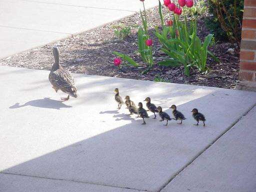 As if the mother duck had it planned all along, she led her ducklings out through the halls and to the sidewalk in front of the school.