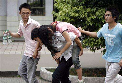 Chinese students help a fainted classmate evacuate to a playground for safety in Qionglai city, southwest China's Sichuan province, Monday after a magnitude 7.8 earthquake struck mountainous central China. Associated Press