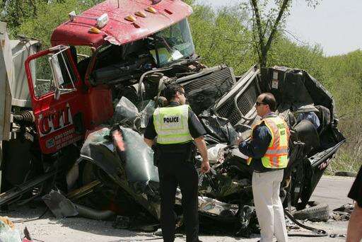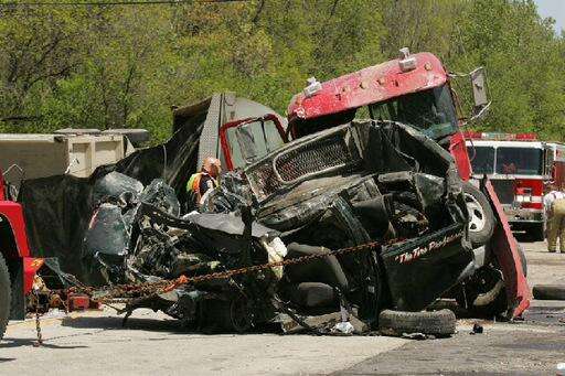 One of the gravel trucks, police said, ended up on the top of the tire delivery truck.