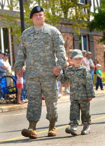 Michael Kruk, a U.S. Army soldier from Lake Zurich, marches Monday with his 5-year-old son, Vincent, during the Lake Zurich Memorial Day parade. Vince Pierri | Staff Photographer