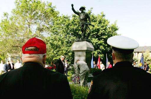 Veterans place a wreath on the Doughboy sculpture Monday in Burlington Park during the Memorial Day service in Naperville. Tanit Jarusan | Staff Photographer