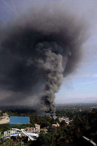 More than 100 firefighters try to prevent the flames from spreading to nearby brush. A thick column of smoke rose thousands of feet into the air and for a time helicopters swept in to drop water. Three firefighters had minor injuries.