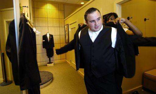 TLC volunteer Kevin Mills of Lombard gets fitted for a tuxedo at MW Tux in Lombard. He plans to marry former TLC camper Janine Jurinak Saturday in Arlington Heights. Marcelle Bright | Staff Photographer