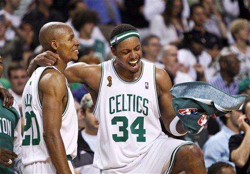 Pierce, the Finals MVP, had 17 points and 10 assists in the clincher, Garnett had 26 points with 14 rebounds, and Allen returned from a red-eye from the coast and a poked eye in the lane to add 26 points, including an NBA Finals record-tying seven 3-pointers.