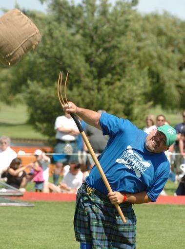 A burly man wearing a kilt spun around, drew his arm back and flung a 28-pound weight some 71 feet through the air.