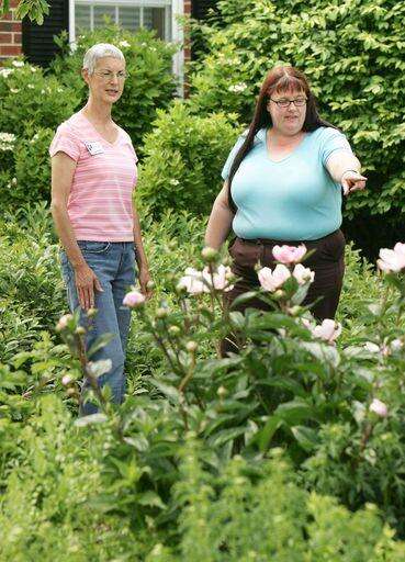 Lake County Master Gardener Nancy Hammer, left, and horticulturist Sharon Yiesla examine the blooming flowers in the garden at the University of Illinois Extension office in Grayslake. Gilbert R. Boucher II | Staff Photographer