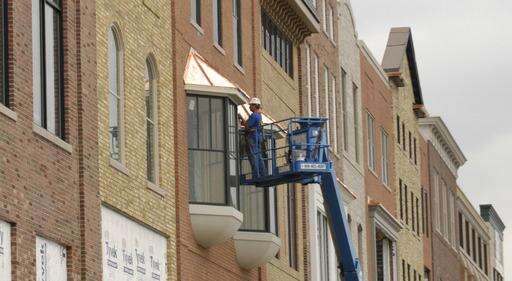 A parking deck going up here. A new grocery and bank over there. Six blocks of sparkling storefronts and condos.
