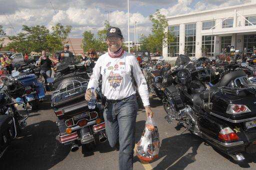 NASCAR star driver Kyle Petty manages a smile Monday after riding from Elkhart Lake, Wis., as he makes his way through the motorcycles to greet a crowd of fans at the Lombard Westin. Scott Sanders | Staff Photographer
