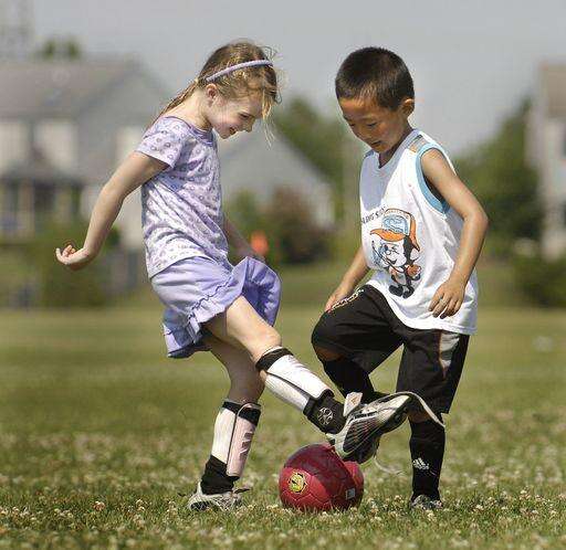 Kira Beers, left, and Tinrey Du, both 6 and from Naperville, battle for ball control during a Chicago Storm Soccer Camp. Marcelle Bright | Staff Photographer