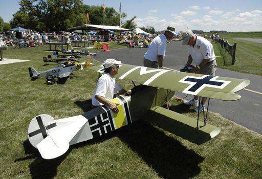 Carl Bachhuber of Mayville, Wis., holds a World War I German fighter plane owned by Chuck Smith, center, of Tillsonburg, Canada, while Dave White, of Belle River, Ontario, starts it up for Smith's flight.