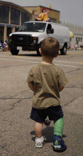 Vance Williams, 1, watches the parade Sunday as part of Coon Creek Days Festival in Hampshire. Despite the leg cast, he was able to scoop up a fair amount of candy thrown from parade floats.