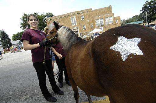 A sparkling star adorns the hindquarters of Walker, a 26-year-old Shetland Pony at the North Aurora Days Pet Parade on Sunday. Lissy Wedell, 14, walked the pony from nearby Huntoon Stables to the Activity Center to start the parade.