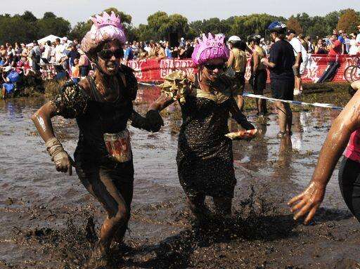 Louisville residents Annette Vitale, left, and Tammra Catron wear evening gowns as they approach the finish line of the Muddy Buddy Race Sunday in Gilberts.