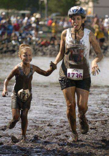 Danielle Scarfe of Crystal Lake helps her 6-year-old daughter Sophia reach the finish of the Mini-Muddy race Sunday Gilberts.