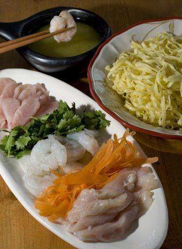 Return to a boil and let boil for 1 minute. Quickly but carefully transfer the broth to a serving tureen and bring to the table along with the platter of meats and seafood and colander of noodles.