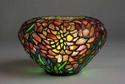 A colorful glass display showcases the creations of glass masters past and present, including a collection of ornate lamps and windows from Dale Comfort Tiffany and Frank Lloyd Wright, as well as works by contemporary artists Lino Tagliapietra and Jon Kuhn.