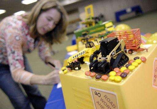 Interlibrary loan clerk Susan Krass labels dioramas entered in Geneva Public Library's diorama contest for children and adults, part of the library's 100th anniversary celebration. This diorama, by Tommy Antonson, is based on the book "Reese's Pieces Count by Five" by author Jerry Pallotta.