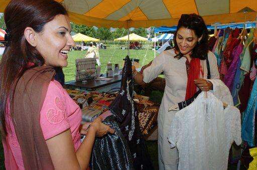 Anila Khoja of Glenview helps Afshi Khan of Roselle make a dress selection at a sales tent during the annual Pakistani Independence Celebration in Hoffman Estates on Saturday.