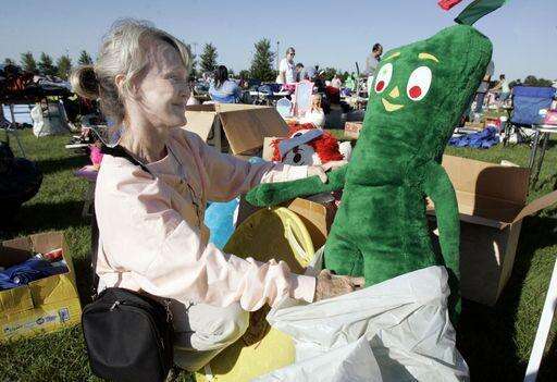 Pam Baldwin of Wood Dale checks out a Gumby doll for sale at the communitywide garage sale Saturday at Camera Park in Glendale Heights.