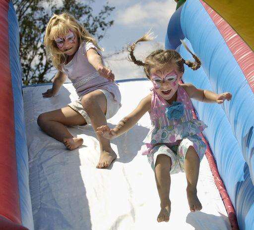 Torrie Webber, left, 6, of Plainfield, and Delaney O'Neal, 3, of Oak Brook, bounce down the slide on the moon jump during the Oak Brook Park District's 2nd annual Summerpalooza .
