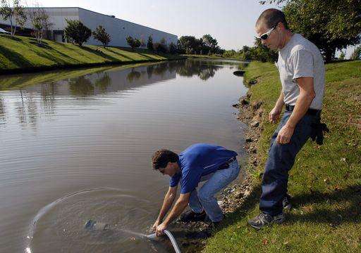 A fish jumped in the brown, turbid pond as a hose sucked water through a filter and pumped out crystal-clear H2O.