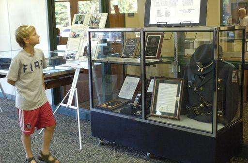 The library exhibit features many of his early photos, badges, awards, a uniform, newspaper clippings and a narrative about his career.