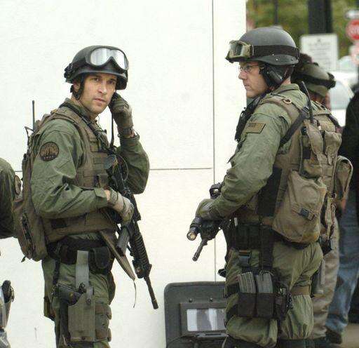 Members of several police SWAT teams dressed in tactical gear and carrying large-caliber weapons scaled rooftops as dozens of squad cars, fire trucks and ambulances converged on evacuated city streets. The FBI also assisted.