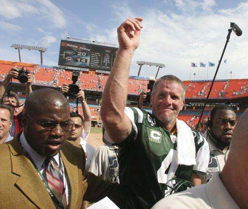 Brett Favre waves as he walks off the field after the Jets defeated the Dolphins 20-14 at Dolphin Stadium in Miami on Sunday. Associated Press