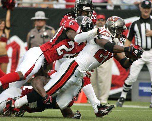 Tampa Bay Buccaneers running back Warrick Dunn (28) carries Atlanta Falcons defenders', including, Domonique Foxworth (24) and Chris Houston (23) into the endzone to score during the second quarter last Sunday. Associated Press photo