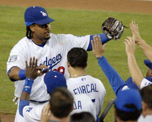 Los Angeles Dodgers' Manny Ramirez is congratulated by teammates. Associated Press