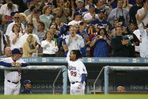 Los Angeles Dodgers' Manny Ramirez waves to the crowd after hitting a two run home run against the San Diego Padres during the sixth inning of a baseball game Sept. 24 in Los Angeles. Associated Press