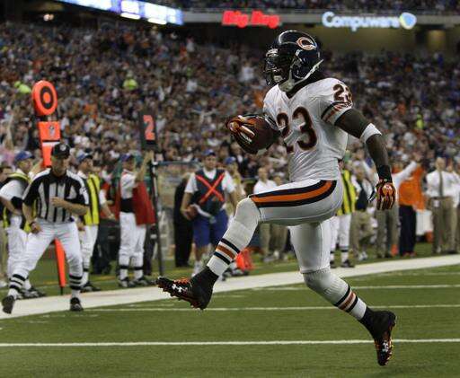 Bears wide receiver Devin Hester scores on a 12-yard reception. Associated Press