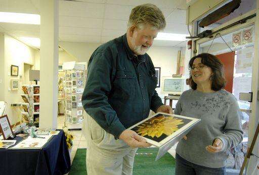 During a reception for Artoberfest at Gallery 200 in West Chicago, Jerry Landerholm of Lombard and Joanne Kalchbrenner of West Chicago admire a print of a dahlia by Marge Hall of West Chicago. Landerholm, who has 300 dahlia plants in his garden and is a member of the Central States Dahlia Society, says dahlias are traditionally known as a "man's flower" because of they're robust and fun to grow. Kalchbrenner is a member of the Gallery 200.