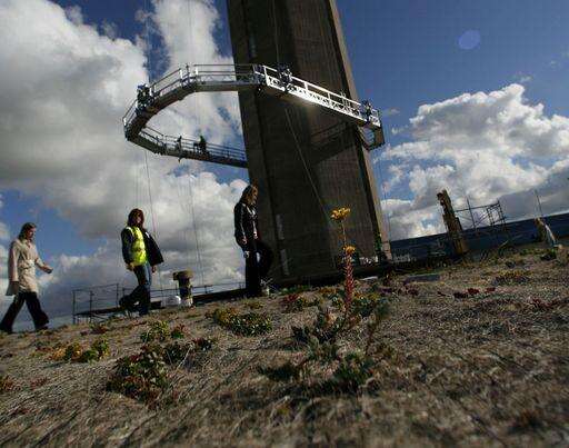 Rosemarie Andolino, executive director of the O'Hare Modernization Program, center, gives a tour of the 10,000-square-foot vegetated green roof atop the new north air traffic control tower's base building. George LeClaire | Staff Photographer