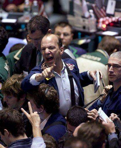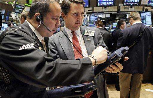 Traders Jeff Vazquez, left, and James Maguire Jr. work on the floor of the New York Stock Exchange. Associated Press