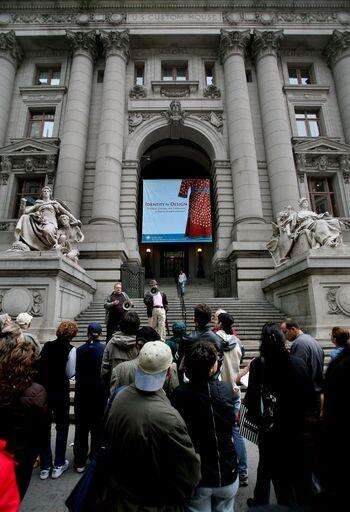 Tour group members listen to tour guides Richard Warshauer, right with megaphone, and James Kaplan on the steps of the former US Custom House during the 20th annual guided walking tour of Lower Manhattan last month. Associated Press