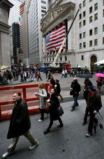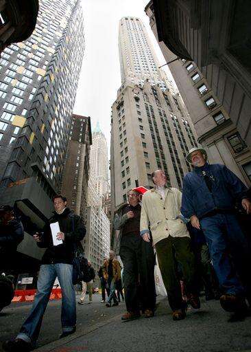 Members of a tour group walk past the New York Stock Exchange during the 20th annual guided walking tour of Lower Manhattan in October. Associated Press